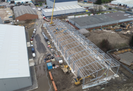 Worked started on site at the beginning of the year at Production Park, South Kirby and is continuing to take shape as the steel frame has now been erected on site. This new build construction is to shell and core a new Employment Unit Building.